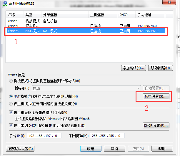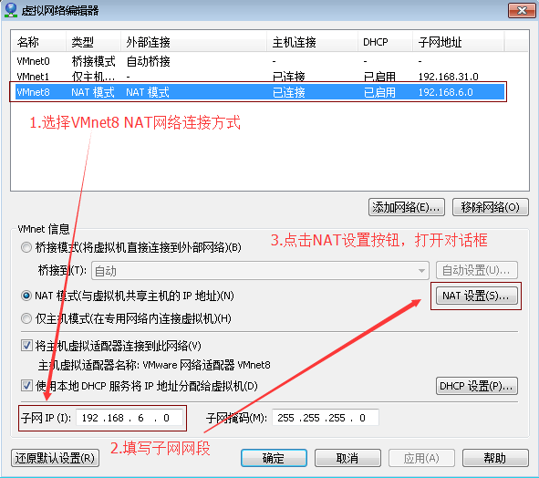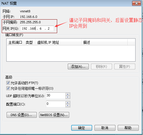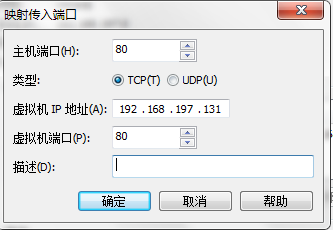 Vmware虚拟机配置局域网web应用 作者:七棵菜 日期:2022-11-30 栏目:计算机分类:90 人气:268 将web站点部署到局域网的虚拟机中,需要明白以下几个术语: - 虚拟机:vmware中安装的虚拟系统 - 宿主机:安装了vmware的电脑 和`宿主机`在同一局域网内的电脑如果想要访问部署在`虚拟机`上的web应用,需要打通以下步骤: - `宿主机`增加入站规则,添加80端口可以访问。 - `vmware`配置`宿主机`的80端口映射到`虚拟机`的80端口 - `虚拟机`增加入站规则,添加80端口可以访问。 ### vmware配置虚拟机IP #### vmware虚拟网络设置 - 点击vmware菜单栏:编辑 → 虚拟网络编辑器,打开虚拟网络编辑器对话框,选择`Vmnet8` Net网络连接方式,设置任意子网IP,点击NAT设置页面,查看子网掩码和网关,如下图:    > 记录子网掩码和网关,后面配置`虚拟主机`时使用。 #### 宿主机 VM8 网卡设置 安装vmware之后,宿主机网卡会多出两个,打开 网络和共享中心 → 更改适配器设置,在`VMware Network Adapter VMnet8`上单击右键,选择属性按钮打开属性对话框。填写上一步的子网掩码和网关。如下图:   #### 虚拟机网卡设置 vmware打开启动虚拟机,打开网络和共享中心 -> 更改适配器设置,右键打开属性对话框,和上一步骤一样,填写相同的子网掩码和网关,IP地址任意。 > 重启`vwware`使配置生效。 ### vmware配置虚拟机端口映射 - 点击vmware菜单栏:编辑 → 虚拟网络编辑器,打开虚拟网络编辑器对话框,选择`Vmnet8` Net网络连接方式,点击NAT设置页面,点击添加端口,如下图:     ### Windows Server 2008 R2 创建入站规则 - 服务器管理器-->配置-->高级安全windows防火墙-->入站规则,进行新建规则。  - 规则类型 选择 端口  - 选择TCP,然后指定端口。  - 操作设置为 允许连接  - 设置 域、专用、公用 均应用该规则。  - 然后为该端口起个名。  ### 鸣谢 - [百度知道](https://jingyan.baidu.com/article/870c6fc3132bebb03fe4be29.html) - [博客园**麦兜日常学习笔记**](https://www.cnblogs.com/chengssblog/p/6531964.html) - [csdn**CooperXJ**](https://blog.csdn.net/weixin_42340926/article/details/104972208) 标签: 虚拟机 局域网 vmware 上一篇:如何使用mvn命令导入依赖 下一篇:attribute和property的区别 随便看看 2022-11-30 配置apache, nginx 支持 angular2+ 等单网页项目路由刷新 2023-08-16 nginx配置angular项目部署在项目子目录 2022-11-30 设置 .gitignore 不忽略文件夹的规则 2022-11-30 git查看某文件最近的修改内容 2022-11-30 实现 git 切换分支后代码互不影响 留言