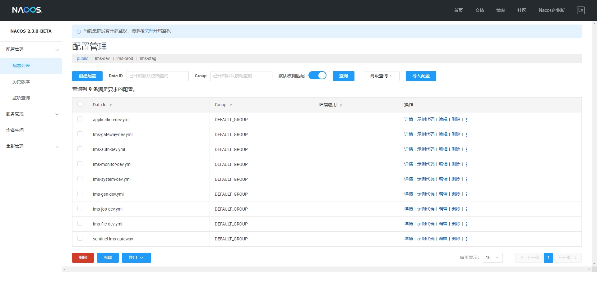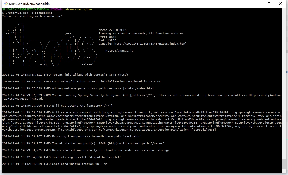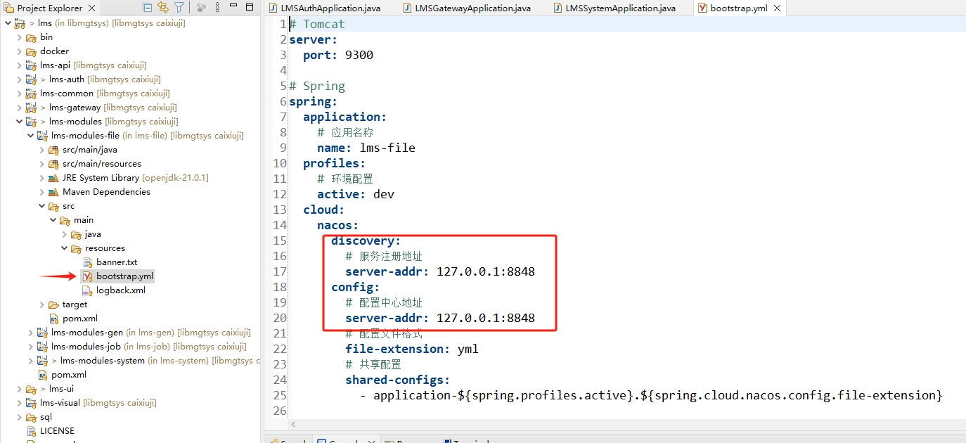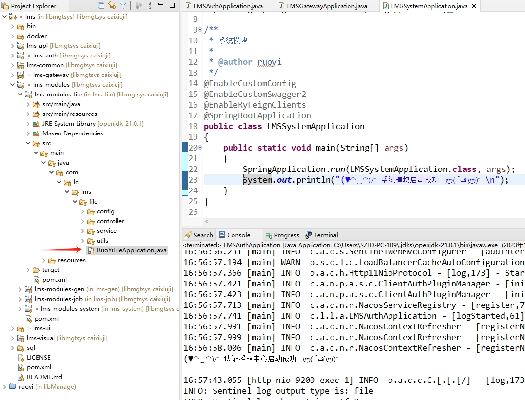 若依系统安装,配置和启动 日期:2023-12-01 栏目:计算机分类:1 人气:315 ### 准备工作 JDK >= 1.8 (推荐1.8版本) Mysql >= 5.7.0 (推荐5.7版本) Redis >= 3.0 Maven >= 3.0 Node >= 12 nacos >= 2.0.4 安装若依框架前后端分离版本需要准备好如上环境 ### 环境配置 其他环境无需配置,仅需要配置nacos。 - 新建一个数据库,例如`nacos`用来存放nacos的数据。 - 官网下载nacos初始化配置`ry_config_2021xxxx.sql`,导入数据库 - 找到本地安装的nacos配置文件`${INSTALL_PATH}conf/application.properties`,更改nacos配置模块存储方式为数据库。 ``` #*************** Config Module Related Configurations ***************# ### If use MySQL as datasource: ### Deprecated configuration property, it is recommended to use `spring.sql.init.platform` replaced. # spring.datasource.platform=mysql spring.sql.init.platform=mysql ### Count of DB: db.num=1 ### Connect URL of DB: # nacos为数据库名称 db.url.0=jdbc:mysql://127.0.0.1:3306/nacos?characterEncoding=utf8&connectTimeout=1000&socketTimeout=3000&autoReconnect=true&useUnicode=true&useSSL=false&serverTimezone=UTC # 数据库用户名 db.user.0=root # 数据库密码 db.password.0=root ### Connection pool configuration: hikariCP db.pool.config.connectionTimeout=30000 db.pool.config.validationTimeout=10000 db.pool.config.maximumPoolSize=20 db.pool.config.minimumIdle=2 ### the maximum retry times for push nacos.config.push.maxRetryTime=50 ``` ### 拉取代码 - 前往Gitee下载页面(https://gitee.com/y_project/RuoYi-Cloud (opens new window))下载代码解压到工作目录。 - 新建一个数据库,例如`ry-cloud`用来存放若依系统的数据 - 从官网下载若依初始化脚本`ry_2021xxxx.sql`,导入数据库 ### 启动nacos - 找到本地安装的nacos的启动文件 ``` ./startup.cmd -m standalone ``` 启动成功显示如下  - 浏览器访问地址(http://localhost:8848/nacos)打开控制界面,用户名密码都是`nacos`,登录之后看到默认配置已导入,类似如下  - 更改`gateway`,`auth`,`system`三个配置文件中的nacos,数据库和redis的地址,账号和密码 ### 启动后端 - Eclipse导入刚刚拉取的代码,已maven项目导入  > 首次导入需要下载依赖,时间依据网速而异,可能会很长,需耐心等待,右下角可以看到进度条,进度条消失标识加载完毕 - 找到三个必须的模块的配置文件`bootstrap.yml`,更改nacos的配置地址  - 分别找到模块主文件`LMSSystemApplication`,`LMSGatewayApplication`,`LMSAuthApplication`  - 在主文件中,右键菜单选择`Run as`>`Java Application`,启动服务,启动成功之后`console`中显示如下信息  ### 启动前端 - VS Code,打开目录下的`ry-ui`文件件 - npm安装依赖 ``` npm install ``` > 时间依据网速而异,可能会很长,需耐心等待 - 开发模式启动 ``` npm run dev ``` - 启动成功之后,浏览器会自动打开地址(http://localhost:80) - 如果出现验证码,使用默认账号能登录,说明系统搭建成功 标签: java 若依 上一篇:如何使用mvn命令导入依赖 下一篇:Docker容器操作 随便看看 2024-02-19 PHP7 运算符“??” 和“?:”的区别 2022-11-30 Linux 后台运行命令 2022-11-25 关于我们 2022-11-30 centos一键系统安装lnmp集成环境 2022-11-30 linux 生成 ssh 公钥 留言