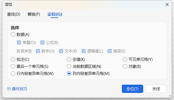 利用wps查询两列内容差异 日期:2025-10-31 人气:8 ### 定位行内容差异单元格 如果两列数据顺序一致,这个方法能快速定位差异。 选择数据区域:同时选中A列和B列需要核对的数据区域。 打开定位条件:按 Ctrl + G 组合键,在弹出的“定位”对话框中选择“列内容差异单元格”。 然后点击“定位”。  查看结果:此时,系统会自动选中那些与A列基准值不同的B列单元格。这些被选中的B列单元格对应的A列数据,可能就是B列缺失或不同的项。  标签: excel 上一篇:mysql权限管理命令 下一篇:使用blender制作数字孪生场景模型比例 随便看看 2026-01-08 如何使用mvn命令导入依赖 2026-01-07 mysql权限管理命令 2025-12-30 哎和唉的区别在哪 2025-12-30 印章小知识——各部分名称 2025-12-15 明初大移民的影响 留言